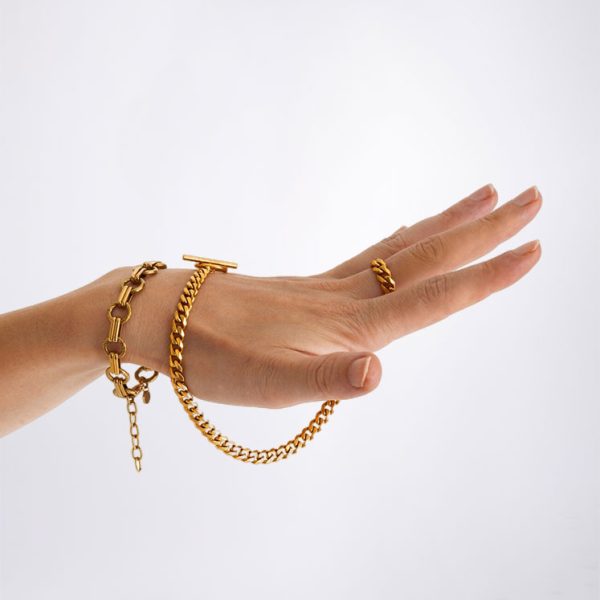 It presents a wrist-hugging oval of gold, punctuated with functional screws.
